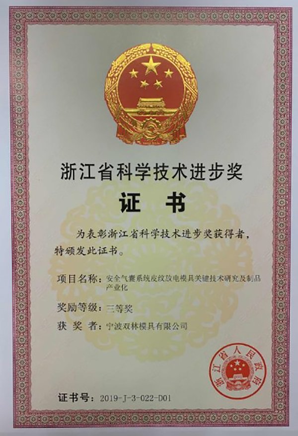 日前浙江省科学技术奖励大会在杭州举行,2019年度浙江省科学技术奖项目公布。双林模具提报的“安全气囊系统皮纹放电模具关键技术研究及制品产业化”课题榜上有名,荣获“浙江省科学技术进步奖三等奖”。此项创新成果是由双林模具模具工厂及注塑工厂的技术研发团队负责的。该课题此前还获得了2017年“浙江省内首台套产品”、2019年“宁波市科学技术奖二等奖”,体现了双林模具在安全气囊领域的技术竞争力。